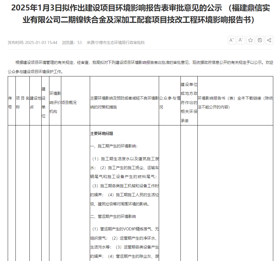 2025年1月3日,寧德市生態(tài)環(huán)境局就福建鼎信實(shí)業(yè)有限公司二期鎳鐵合金及深加工配套項(xiàng)目技改工程環(huán)境影響報(bào)告書作出審批意見(jiàn)并對(duì)外進(jìn)行公示,公示時(shí)間:2025年1月3日-2025年1月9日(5個(gè)工作日)。